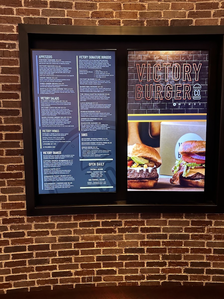 Victory Burger & Wings Co. specializes in American cuisine, showcasing a menu that promises to tantalize your taste buds with bold flavors. Start your meal off with their Victory Nachos, an irresistible heap of crispy tortilla chips generously topped with creamy blanco cheese sauce, fresh veggies, and zesty jalapeños, all served alongside sour cream and chunky salsa for a burst of flavor in every bite. For those looking for something more substantial, the Signature Victory Burger stands tall as a must-try. This half-pound gem is expertly seasoned, crowned with hand-cut cheddar cheese and thick bacon, enveloped in a creamy victory sauce that will leave you savoring every delicious morsel. Pair your burger with their Seasoned Waffle Fries—crispy and perfectly seasoned, you won't be able to stop at just one.
